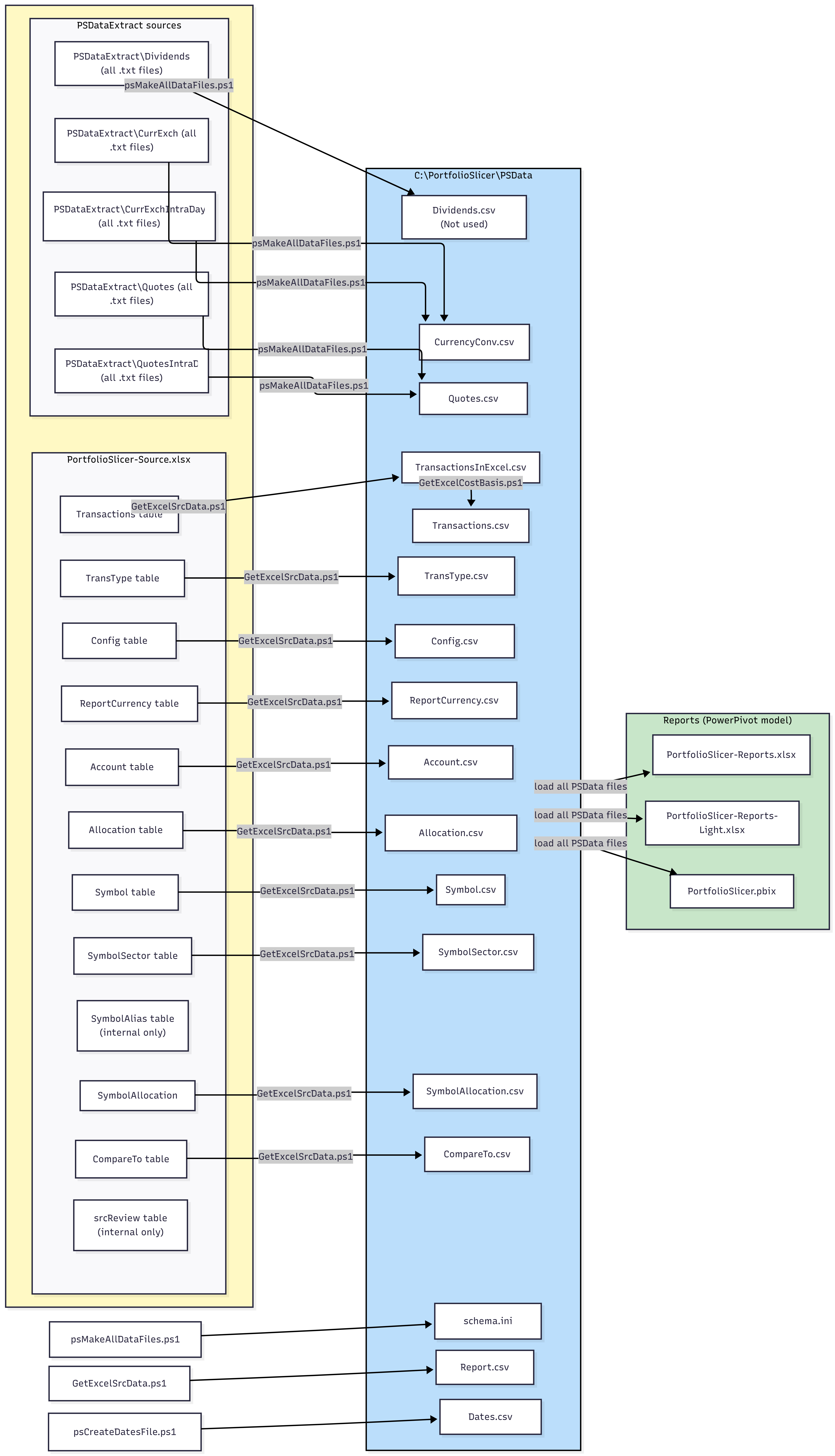 The diagram below shows Portfolio Slicer source data and how it moves into the C:\PortfolioSlicer\PSData folder and then into the report files. Click the image to open a larger version.