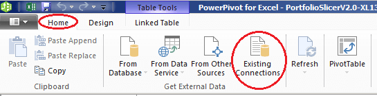 - From the Power Pivot window Home menu select “Existing Connections” button.