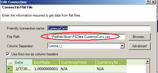 Portfolio Slicer report workbooks come with connections configured to load files from C:\PortfolioSlicer\PSData\ folder