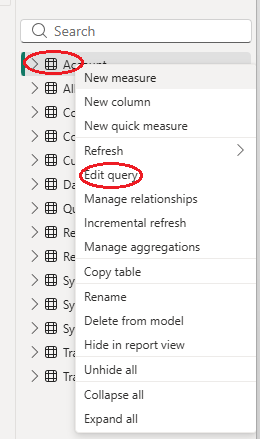 Accounttable and select “…” at the end of the table to give youMore optionsmenu. SelectedEdit querymenu item.