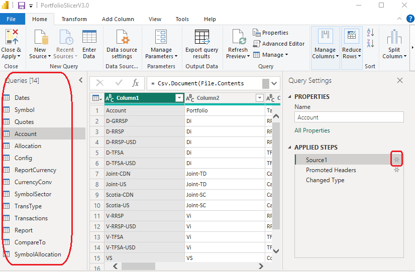 The Portfolio Slicer Power BI file contains tables that are loaded from the files for Portfolio Slicer reports