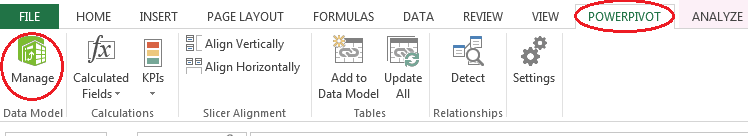 - Open the Power Pivot management interface (Click “Power Pivot” - > “Manage”).